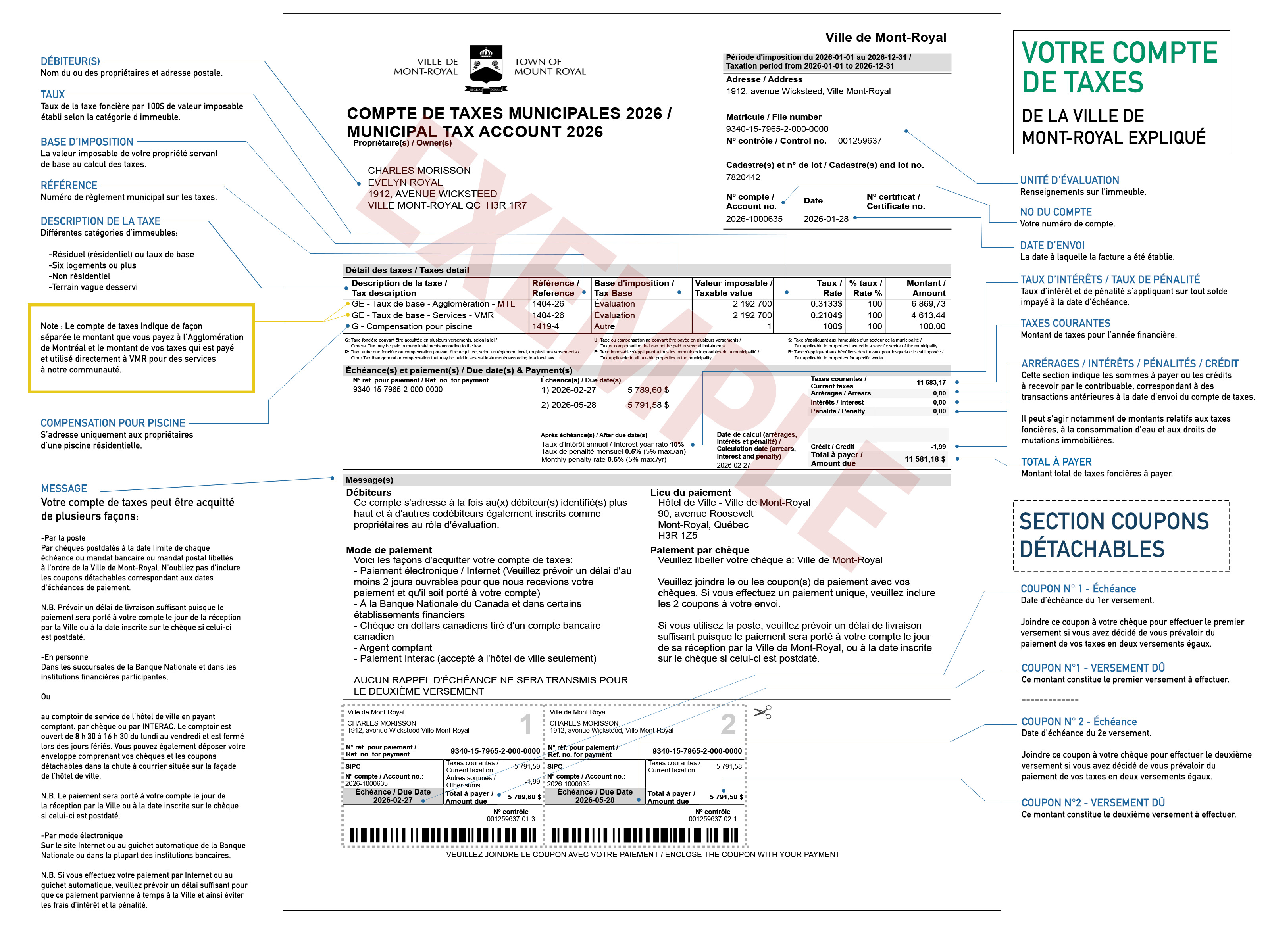 La Ville de Mont-Royal est responsable de percevoir les taxes foncières et le droit de mutation immobilière.